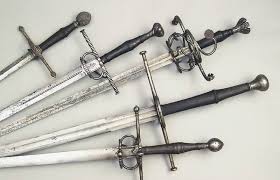 You should try researching sword designs. Typically a basic sword would have a blade, used for thrusting and slicing; a crossguard, to protect your hand; a grip for your hand to firmly grasp and a pommel so that your hand wont slip through the hilt as you're swinging it.